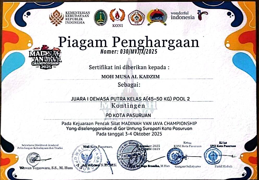 The achievement of MOH MUSA AL KADZIM received high appreciation from the ranks of the government and local sports organizations. The certificate of appreciation for his victory was officially signed by representatives of the Ministry of Culture of the Republic of Indonesia, the Mayor of Pasuruan, and the Chairman of KONI Pasuruan City.