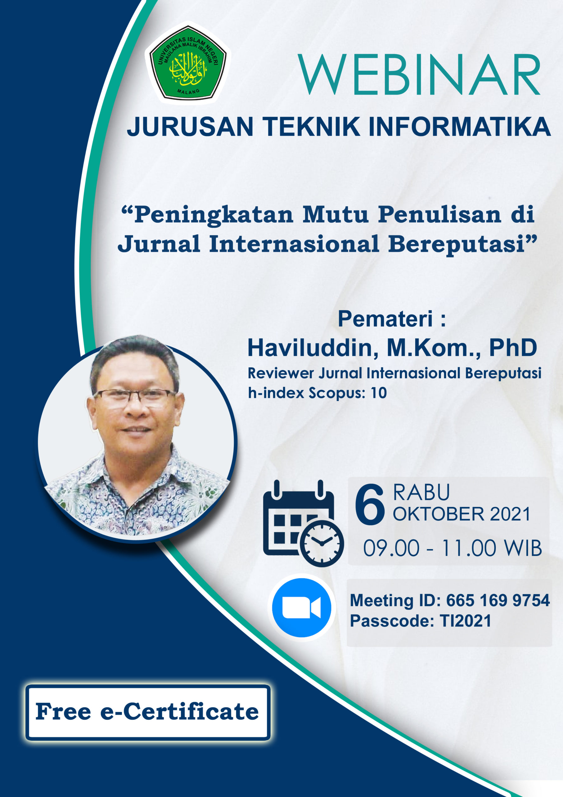 A webinar has been held on 6 October 2021 by presenting Haviluddin, M.Kom., PhD (Reviewer Jurnal Internasional Bereputasi & h-index Scopus:10) Lecturer of Department of Informatics, Faculty of Engineering, Universitas Mulawarman with the agenda as follow: