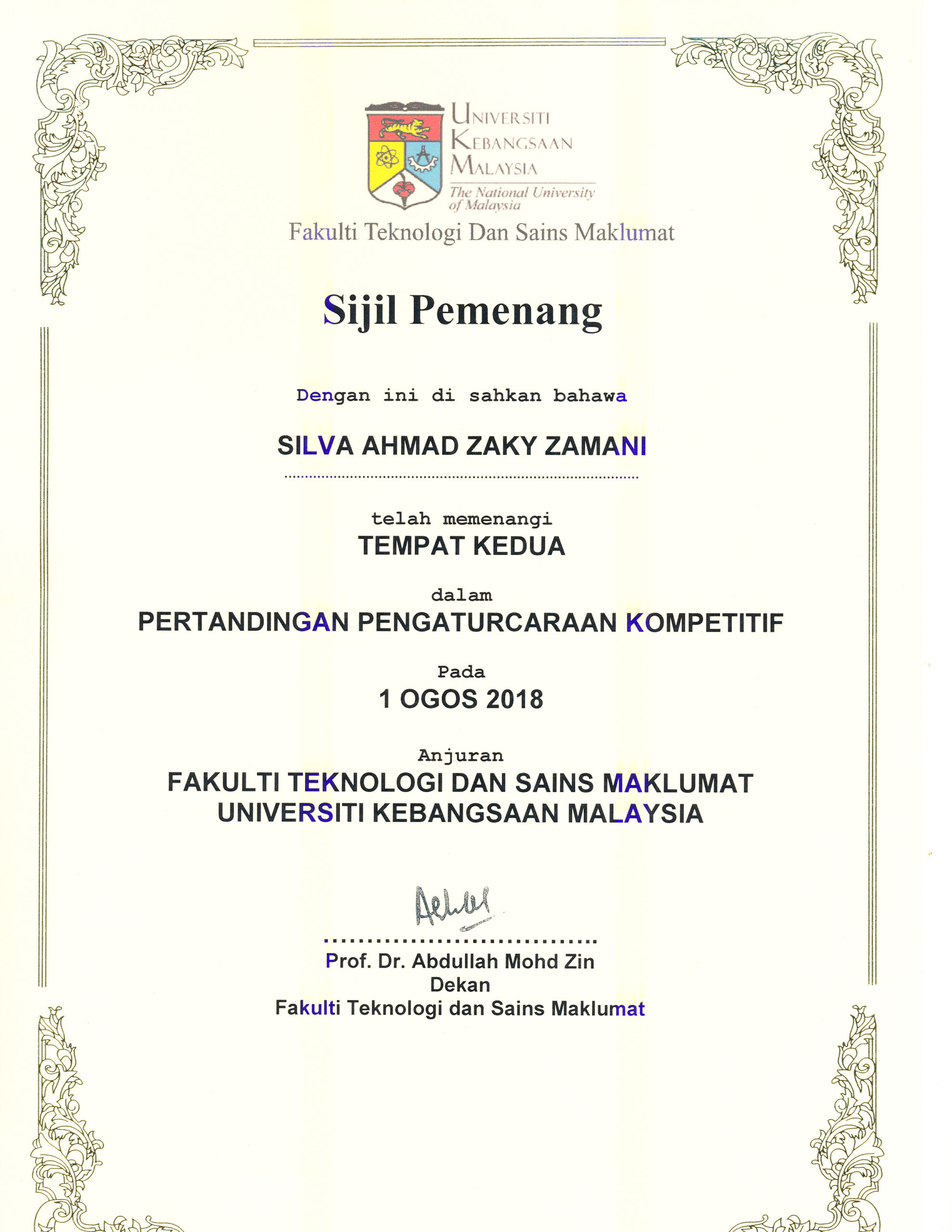 Selamat untuk Silva Ahmad Zaky Zamani atas pencapaian Juara 2 dalam Kompetisi Pemrograman Kompetitif, Universiti Kebangsaan Malaysia, 1 Agustus 2018.