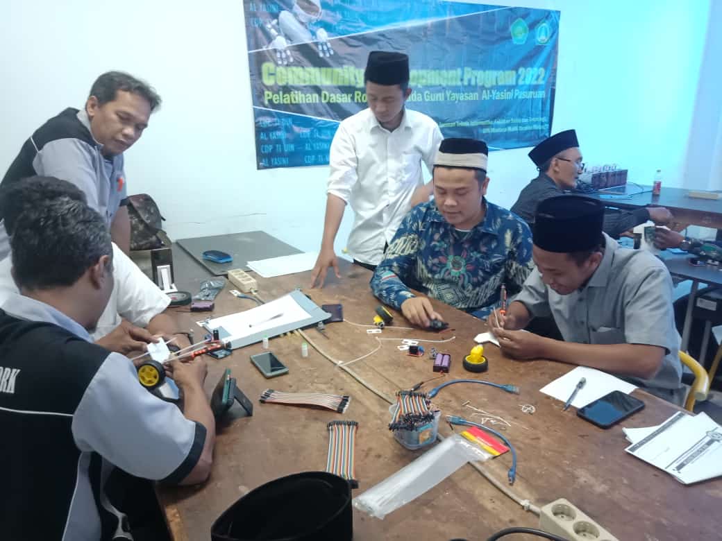 Community Development Program (CDP) 2022 with Yayasan Ponpes Al-Yasini was held on Tuesday, May 31, 2022, at Digital and Robotic Laboratory. This activity is a follow-up to the CDP program which was previously conducted online. The material for this activity is to make an obstacle robot using Arduino Uno and which was attended by teachers under the Alyasini Foundation, Pasuruan, including vocational school teachers, junior high school teachers, MAN teachers, teacher representatives.