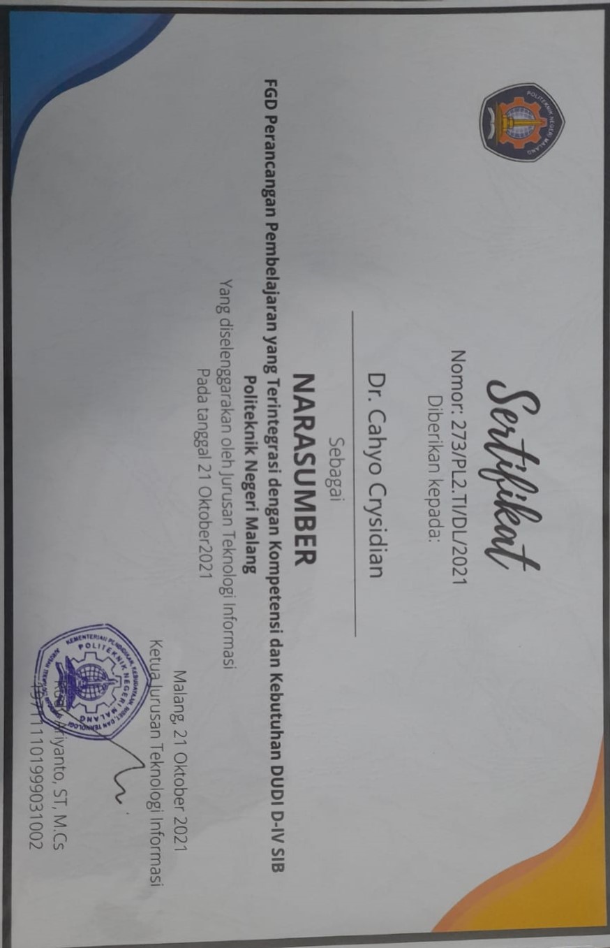 Evaluasi kurikulum Departemen Sistem Informasi Bisnis POLINEMA dilakukan oleh Dr. Cahyo Crysdian di Jurusan Teknologi Informasi pada tanggal 21 Oktober 2021. Kegiatan tersebut merupakan bagian dari kolaborasi universitas antara UIN Maulana Malik Ibrahim Malang dan POLINEMA dalam kegiatan akademik dan program pengembangan masyarakat.