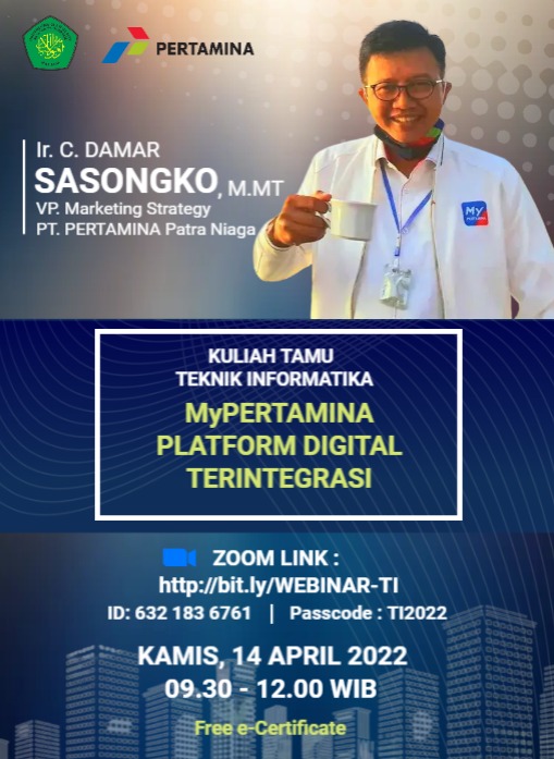 Teknik Informatika held an event a guest lecture to discuss the MyPertamina Platform Digital Terintegrasi was held on Thursday, 14 April 2022 by online webinar. The event present a keynote speaker by Ir. C. Damar Sasongko, M.MT from Vice President Marketing Strategy P.T Pertamina Patra Niaga. Hundreds of participants (300) joined with the event that included the researchers, the lecturers, the students, and some professionals from some local universities and industry.