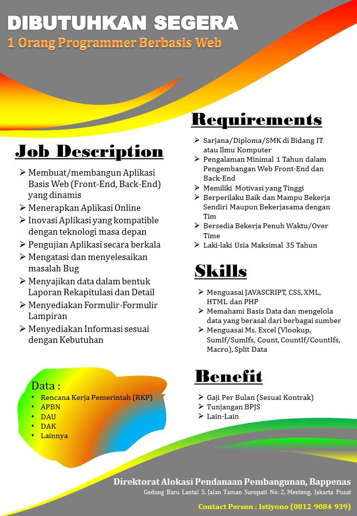 Dibutuhkan Programmer web dengan spesifikasi sebagai berikut: