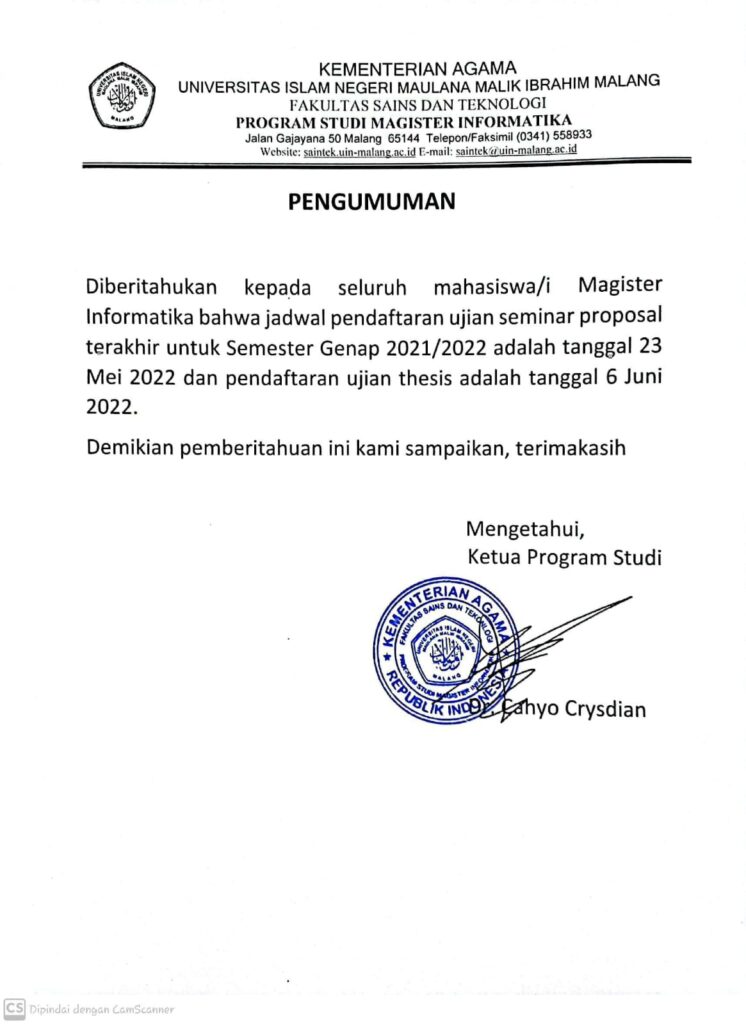 Diberitahukan Kepada seluruh mahasiswa atau mahasiswi Magister Informatika bahwa jadwal pendaftaran ujian seminar proposal terakhir untuk semester Genap 2021-2022 adalah tanggal 23 Mei, sedangkan pendaftaran ujian thesis tanggal 6 Juni 2022 Demikian atas perhatiannya disampaikan terima kasih Download Pengumuman :