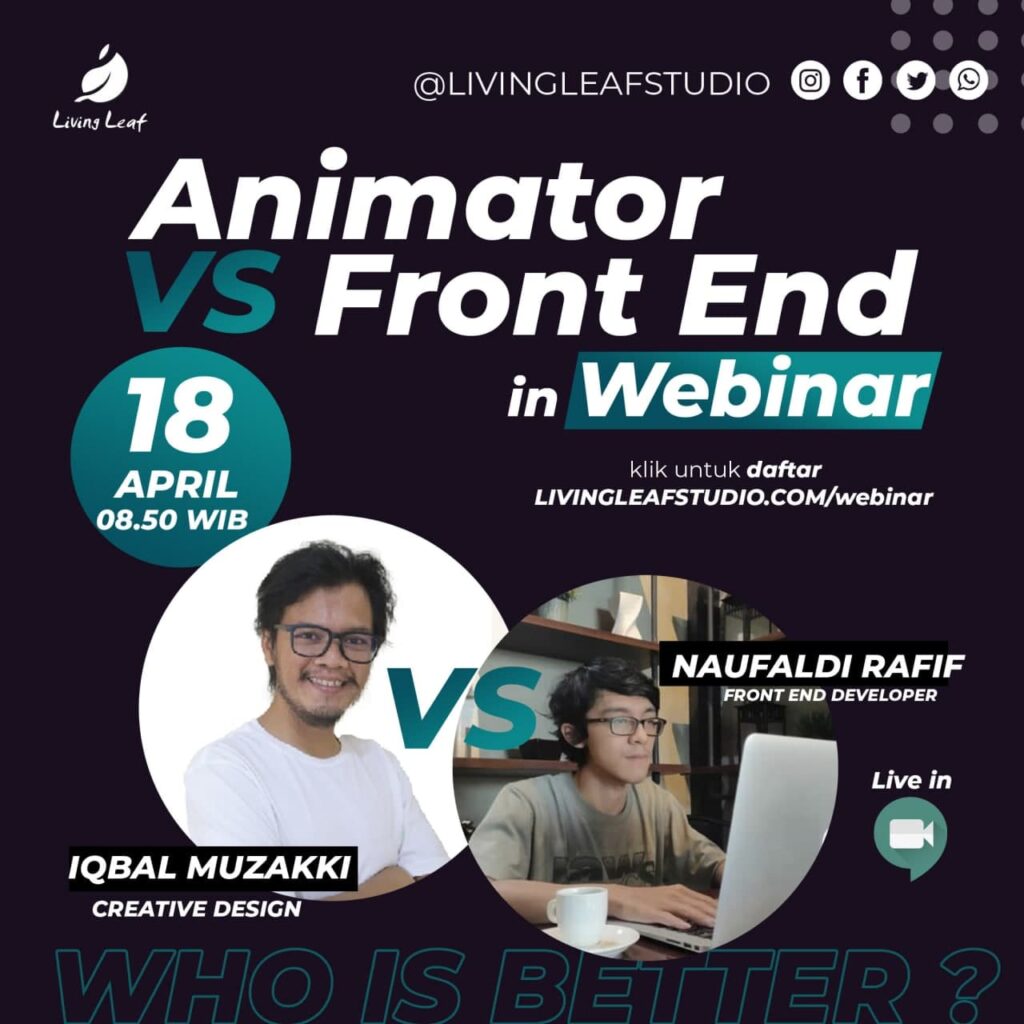 Living Leafe Studio hosts a Webinar event with theme “Animator VS Frontend” as follow: Theme: Animator VS Frontend Keynote speaker: Iqbal Muzakki (Creative Design ) VS Naufaldi Rafif (Frontend Developer) Date/ Time : Sunday, 18 April 2021, 08.50 WIB Venue: Zoom meeting Registration : http://livingleafstudio.com/webinar/ Flyer :