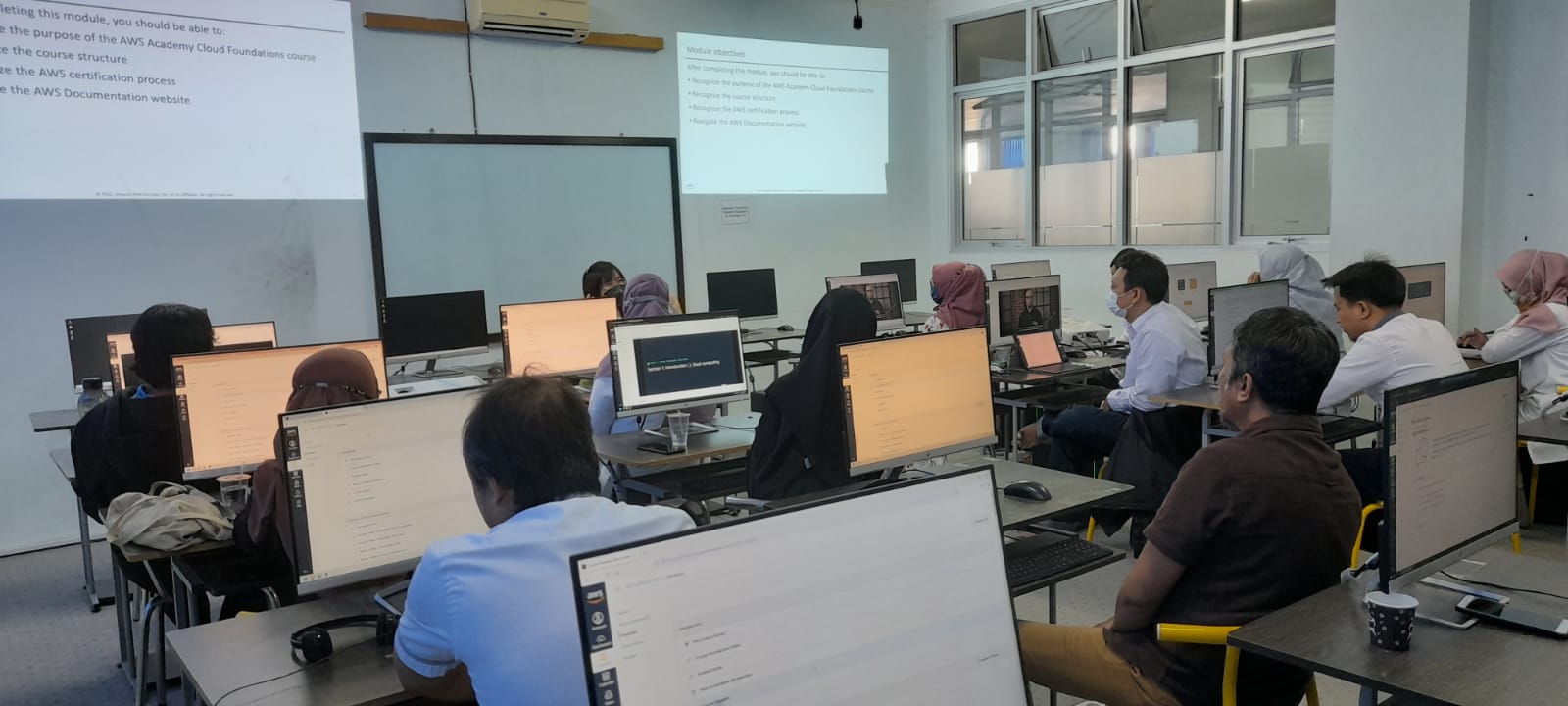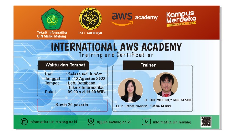 Informatics Engineering in collaboration with ISTTS Surabaya, AWS Academy, Merdeka Indonesia Jaya Campus held training and certification in the cloud field for lecturers, employees and students with. This activity has been carried out on Tuesday to Friday, August 9-12 2022, with 20 participants, at the Informatics Engineering Database Laboratory. The trainer in this training is Dr. Ir. Esther irawati S. S.Kom, M. Kom & Dr. Joan Santoso, S. Kom, M. Kom.